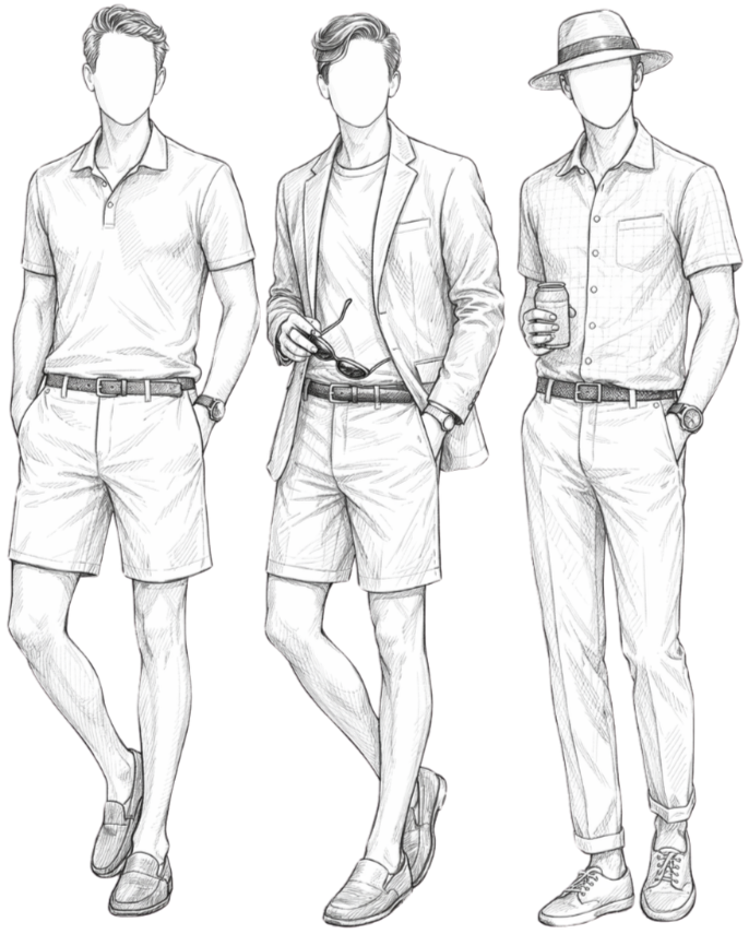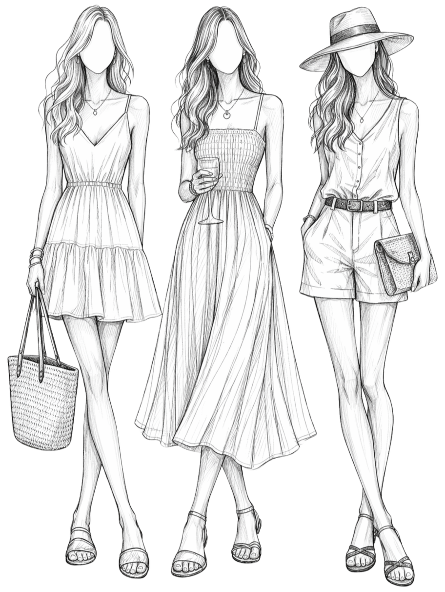 Think a little dressy, a little relaxed — something you might wear to a sunset gathering at a lakehouse or an evening at a country club. Summer dresses, tailored separates, linen sets, breezy button-downs, polished polos, midi skirts, tailored trousers, dressy shorts, and lightweight layers all fit right in
